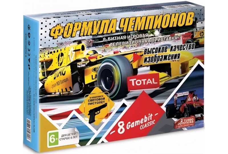 Испытываете игровую ностальгию? Хотите вспомнить своё детство, как играли с друзьями многие часы подряд в танчики, черепашки ниндзя, контру, Чип и Дейл, Super Mario, и конечно же в игры для светового пистолета, особенно Duck Hunt (Утиная Охота)? В таком случае, 8 bit Приставка 8gamebit FA (Формула Чемпионов) великолепно вам подойдёт по всем параметрам. Консоль полностью совместима с обычными картриджами для Денди, в том числе сохранившимся с 90х годов как фирменными от компании Стиплер, так и обычными китайскими. Корпус выполнен в миниатюрном формате, благодаря современным технологиям, что позволяет размещать приставку на полке около телевизора. Слот для картриджей закрыт двумя створками, которые благодаря особой конструкции автоматически закрываются при отсутствии картриджа, что обеспечивает хорошую защиту от пыли. Самое главное - в комплекте вместе с джойстиками идёт световой пистолет. Теперь вы снова сможете ощутить те весёлые эмоции, когда ваш восьмибитный охотничий пёсик на экране телевизора смеётся над вами, когда вы промазали по уткам, или же гордо демонстрирует подстреленные вами охотничьи трофеи. Качество и прочность пластикового корпуса консоли, геймпадов и пистолета на высоком уровне уровне. В комплекте также каартридж с несколькими играми, в том числе для светового пистолета.